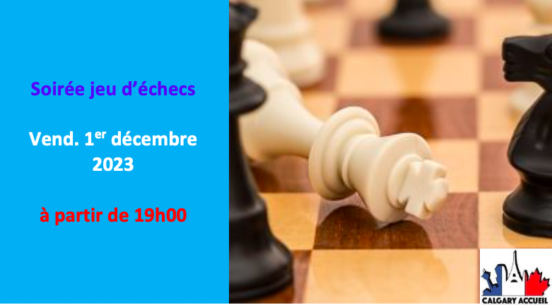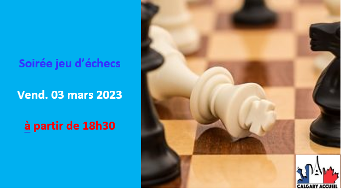 calgary CalgaryLe club d'échecs vous invite à sa prochaine rencontre Que vous soyez débutants, intermédiaires, confirmés, ou tout simplement si vous voulez apprendre à jouer, rendez-vous le vendredi 03 fèvrier 2023 à partir de 19h L'adresse exacte vous sera communiquée aprés confirmation de votre inscription. Pour tout renseignements complémentaires ou confirmation de votre présence merci de …